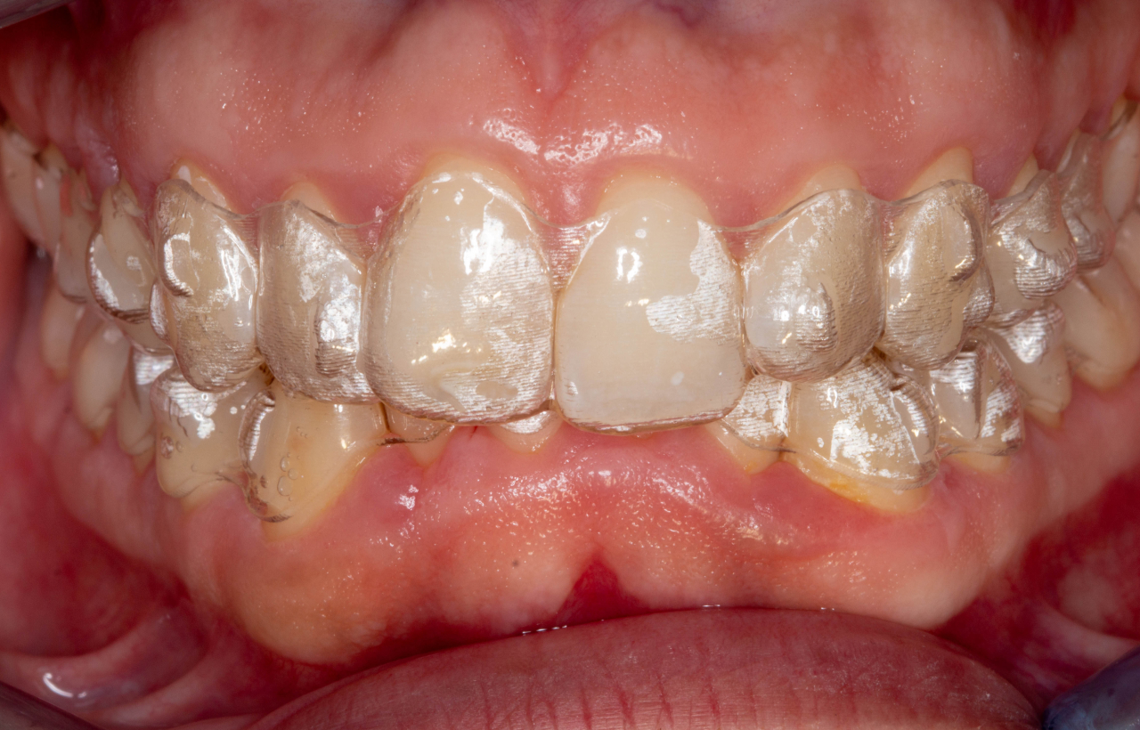 É utilizado uma serie de alinhadores sequenciados feitos à medida dos seus dentes movendo-ps pouco a pouco ate chegar à posição final inicialmente projetada.